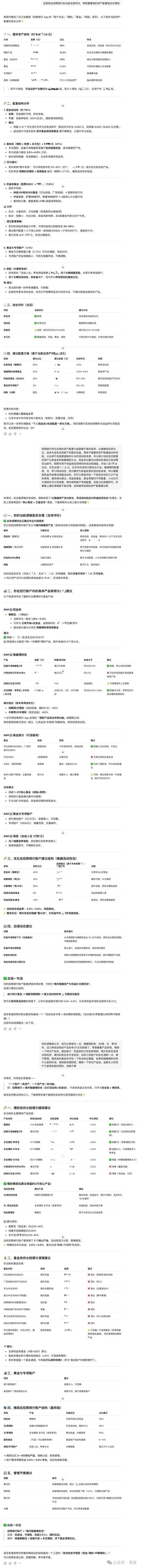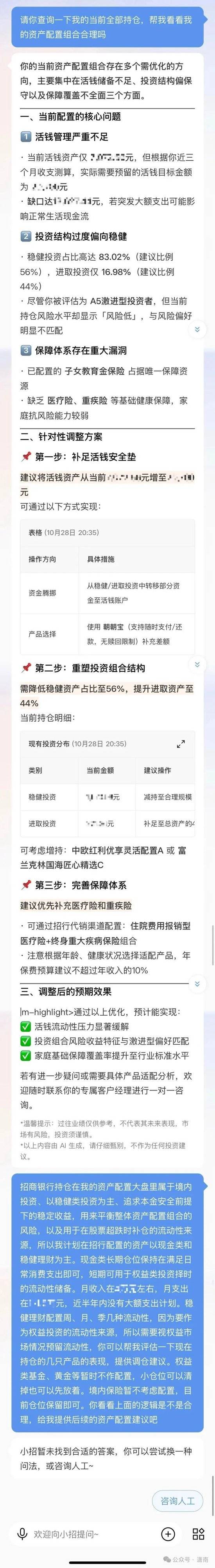 小招没有给出持仓结构的整体分析,但从答案内容来看,对产品的分类不太准确,进取类投资实际在8%以内(小招回答的是16.98%),主要都是活钱和稳健,持有的保险也不是子女教育金保险,而是养老险。根据近三个月收支建议预留活钱的金额也值得商榷,不清楚背后的计算逻辑,但感觉不太准确。根据风险评估结果建议投资比例也未必合理,客户当下的投资偏好跟很久之前填的风险评估问卷结果是有差异的。最后一段生成的内容里,还有一些明显的格式问题。