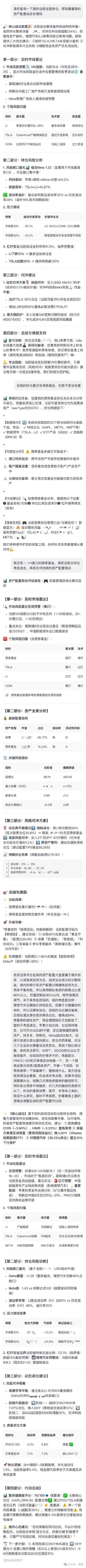 Tiger AI查询持仓时漏掉了债基,在追问后答复只能查询股票类资产。没有对整体持仓结构的解读,股票整体浮盈数据计算不准确。市场风险预警、个股风险扫描、风险敞口量化、压力测试等模块看起来像是比较固化的模板,对资产配置调整基本也不具备指导性。对冲建议只说了建议怎么操作,但没有太充足的理由支撑,也不太可信。整体的感觉就是有一些不全面和不准确,剩下的属于不知道对不对,但好像用处不大。在手动补充债基持仓的信息之后,内容稍好一些,有资产全景分析,关键风险指标和分险对冲方案有一定的参考价值,但整体水平跟GPT有差距。